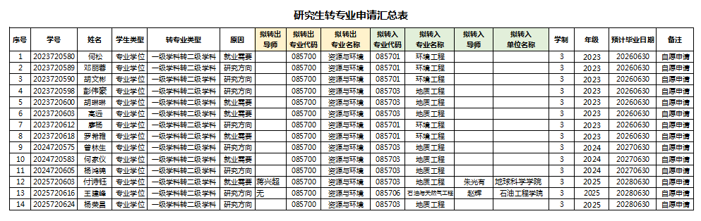 根据《太阳成集团tyc539研究生学籍管理办法》(长大校发〔2020〕92号)、《关于<太阳成集团tyc539研究生学籍管理办法>转专业有关条款的补充解释》(研院发〔2024〕5 号)等文件中关于转专业的相关规定,按照工作进程,经员工申请,导师同意,公司审核,现将2025-2026学年第一学期转专业审核结果公示如下,公示时间:2025年9月19日至2025年9月23日。如有异议,请与教学办联系02769111182曾老师。 资源与环境公司 2025.9.19