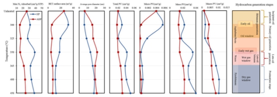 (柳波 文)页岩孔隙结构是决定页岩油气储量和影响流体流动的关键因素。页岩包含复杂的有机-无机组成,叠加成熟作用影响,使其存在各种类型的孔隙。这些孔隙大小和形态各异,使孔隙网络具有高度的非均质性和复杂性。国际IUPAC的孔径分类方案使用最为广泛,但并不完全适用于对页岩孔隙网络进行深入表征。因此,通过不同条件的热模拟实验,再现页岩孔隙结构的演化过程,并使用AI模型深入分析孔径分类及其在成熟作用下的发育规律,有助于我们更好地理解页岩的存储和流体流动能力。柳波团队通过实验研究、机理解释和模型开发,研究了有机质类型以I型干酪根为主的页岩在含水和无水热解过程中孔隙结构演化过程,于2023年1月和7月,《燃料》(Fuel)和《能源》(Energy)分别在线发表了题为“Evolution of porosity in kerogen type I during hydrous and anhydrous pyrolysis: Experimental study, mechanistic understanding, and model development”和“Pore structure evolution of Qingshankou shale (kerogen type I) during artificial maturation via hydrous and anhydrous pyrolysis: Experimental study and intelligent modeling”的论文(https://doi.org/10.1016/j.fuel.2022.127149;https://doi.org/10.1016/j.energy.2023.128359)。