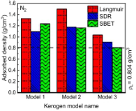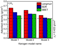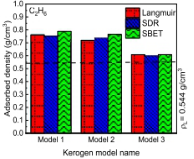 图1干酪根基质模型1、2和3中,对(a) CH4、(b) C2H6、(c) CO2和(d) N2的吸附密度进行了比较,这些吸附密度是基于Langmuir、SDR和SBET模型计算得出(水平虚线表示气体密度的实验值)(审核:孟强)