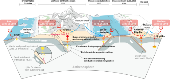 基于上述问题,公司水文与环境系刘明亮副教授联合中国科公司地质与地球物理研究所孔彦龙研究员及中国地质大学(武汉)郭清海教授,围绕高温地热系统中Li、Rb、Cs的来源与富集机制开展了系统研究。研究团队梳理并整合了全球典型岩浆-热液高温地热系统的地热水水化学数据(图1),分析了Li、Rb、Cs的空间分布特征及其与热储温度、盐度和围岩化学成分的耦合关系,进一步厘清了水–岩反应、岩浆流体输入与构造背景对稀有金属富集的控制机制,构建了多阶段富集演化模型,为关键矿产资源在地热系统中的成矿机制提供了理论支撑。研究取得的主要认识和结论如下: