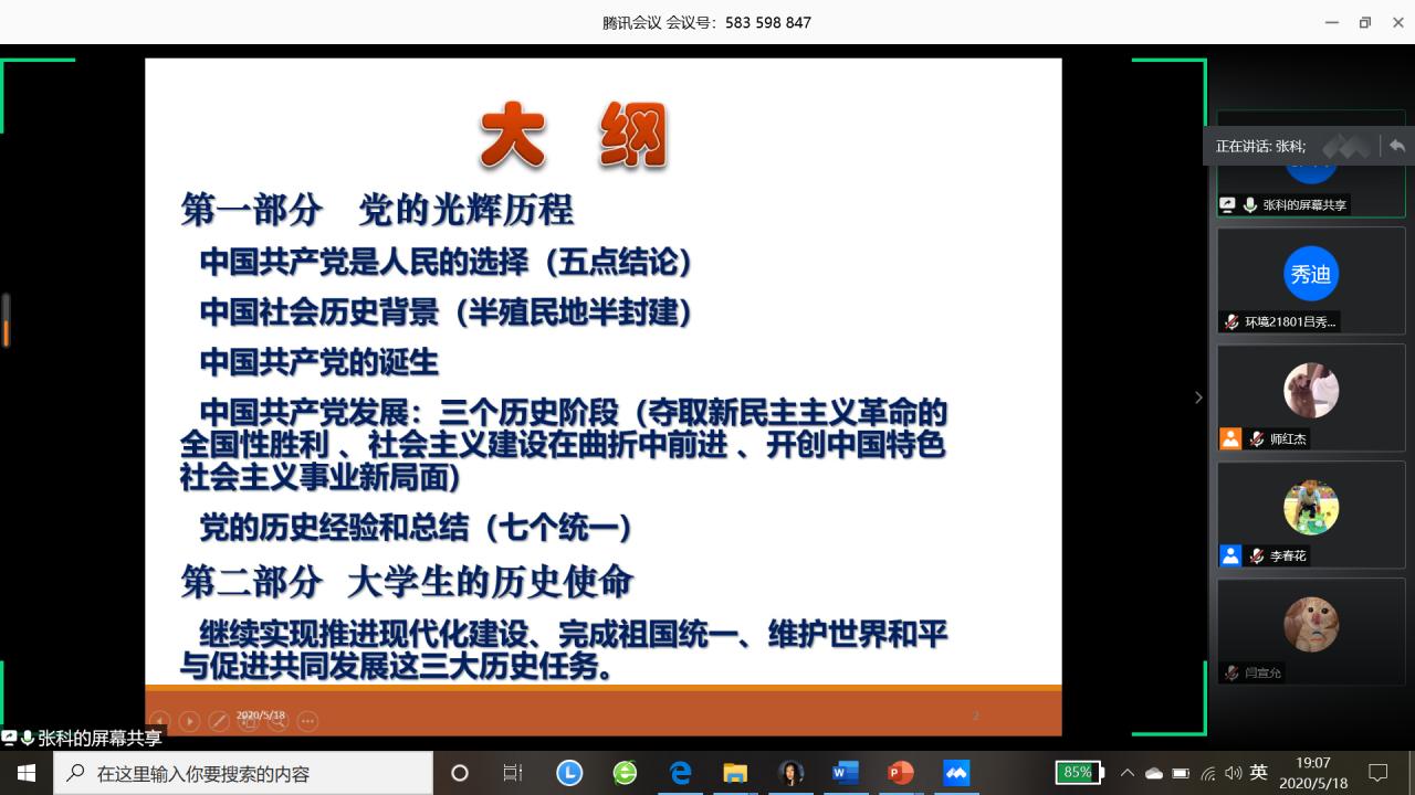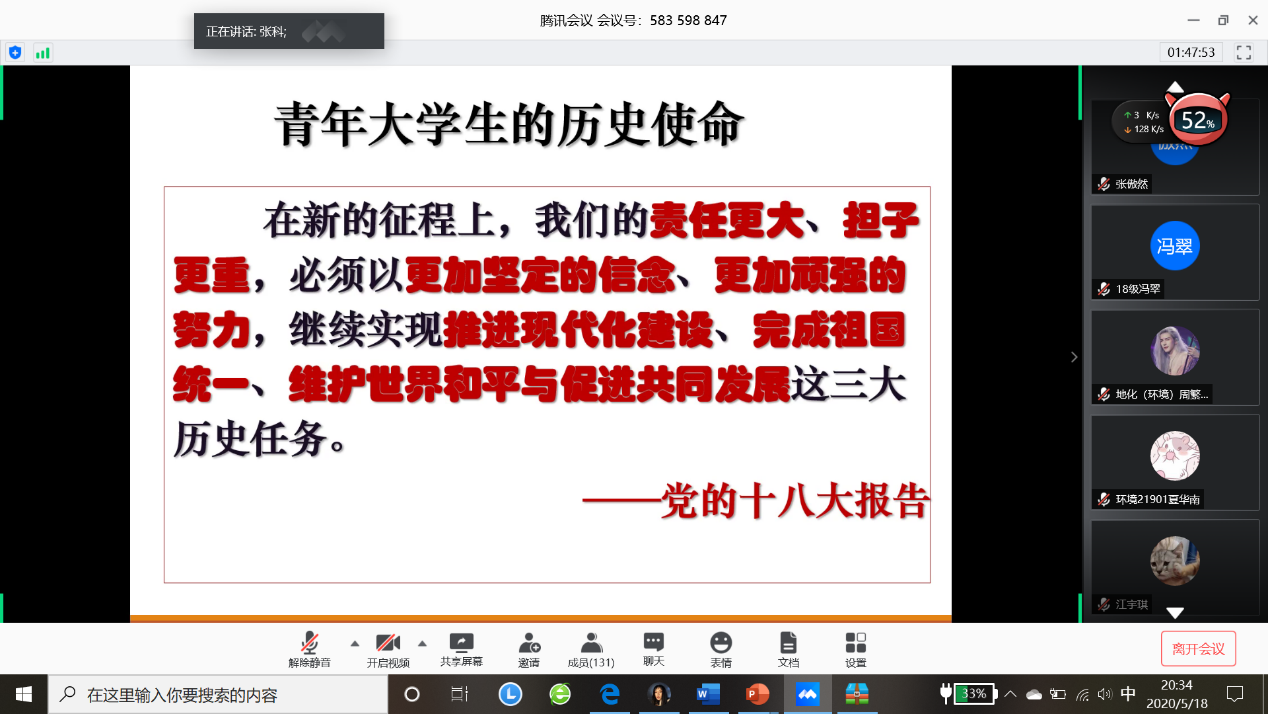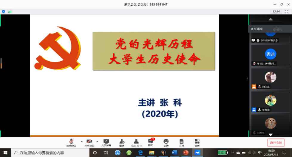 (图/文:吕秀迪)为进一步做好资源与环境公司党员发展工作,加强对发展对象和入党积极分子的教育和培养,引导其提高思想觉悟,保证发展新党员的质量。太阳成集团tyc539于2020年5月18日晚19:00以线上腾讯会议的形式举行了2020年上半年入党积极分子和党员发展对象培训会议。公司党委书记张科主讲,党委副书记范梅英参加、本科员工工作党支部书记李春花主持,共130余名入党积极分子和党员发展对象线上学习。