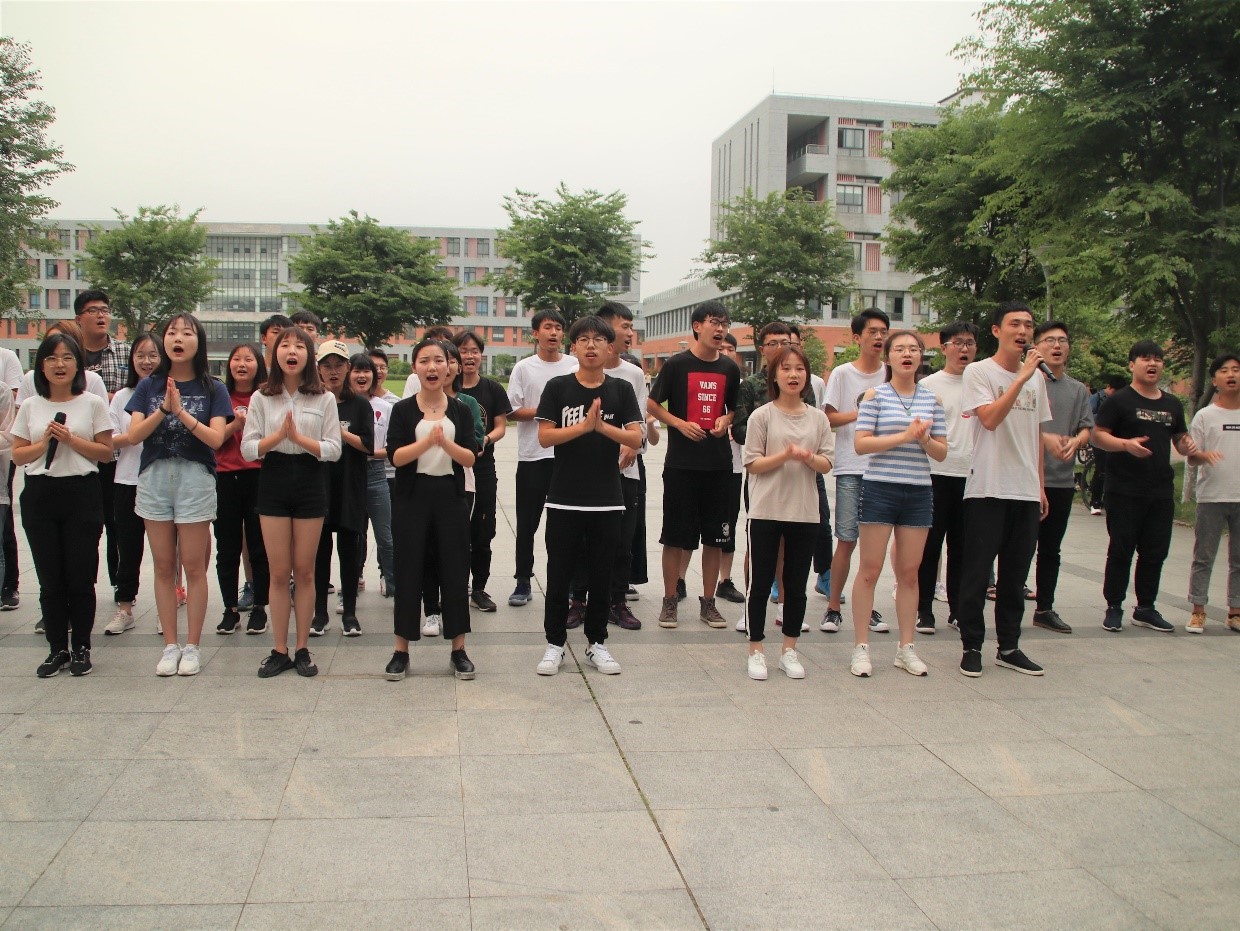 “每一个青年都值得点赞,新时代的我们走向明天!”青春活力的表演让现场瞬间一片沸腾,许多同学都被这热闹的气氛吸引、感染,甚至加入他们合唱的行列,共同歌颂伟大祖国,在“快闪”中一起感受资环新青年们的昂扬风采。