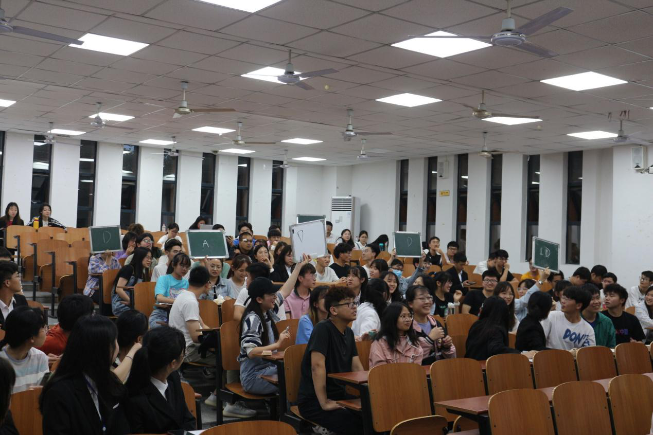 活动伊始,由主持人分别介绍今天到场的嘉宾以及参赛的六支队伍,并简要介绍初赛的四个环节:基础比拼、红包抢答、互动环节以及抽签自答。在基础比拼环节中,同学们只有二十秒作答时间,当PPT上的问题出现时,每位选手都在自己的队伍中提出自己的想法并共同决定了队伍最终答案,当主持人公布答案时可谓“一家欢喜一家愁”。在基础比拼后,进入最精彩的红包抢答环节,最快抢到红包的队伍将获得答题权,每位选手都聚精会神,为获得答题权不愿意分神一刻。互动环节中,每位现场观众都踊跃参与,与主持人一起互动,不仅认识了许多地形地貌,还使得现场氛围活跃起来。在令各位选手最煎熬的最后这一环节——抽签自答中,答对队伍会获得相应分数,答错则会扣除相应分数。选手们步步为营,一边思考如何选题对队伍更有利,另一边又思考怎样答对问题。