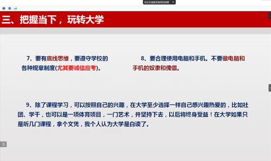 最后,范梅英老师给同学强调了疫情防控、防范电信诈骗、个人隐私保护、宿舍消防安全、诚信应考等问题,强调安全第一,希望同学们珍惜珍爱生命,在太阳成集团tyc539健康快乐度过大学四年生活。