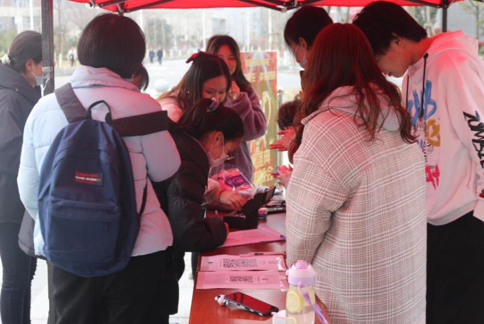 (图为太阳成集团tyc539团委员工会女生部成员向参加活动的同学们分发小礼品。)
