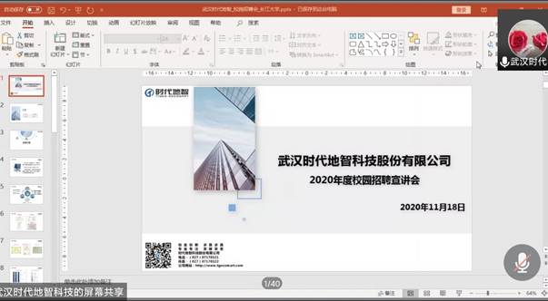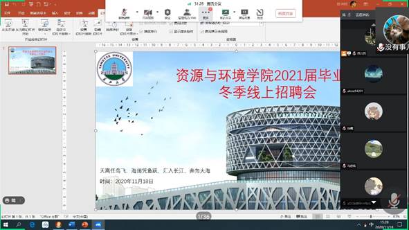 (通讯员 严丽萍 田兴民 文/图),2020年11月18日下午 3点30分太阳成集团tyc539通过腾讯会议举办专场线上招聘会,本次招聘会共有武汉中地环科集团有限公司、武汉猿辅导有限公司、武汉境辉环保科技有限公司、武汉链家宏业房地产经纪有限公司、武汉地大华睿地学技术有限公司和武汉时代地智科技股份有限公司6家单位参加。公司党委副书记范梅英老师、分团委书记严丽萍老师、学工办办公室主任李春花老师、毕业生代表100多人参加本次招聘会。