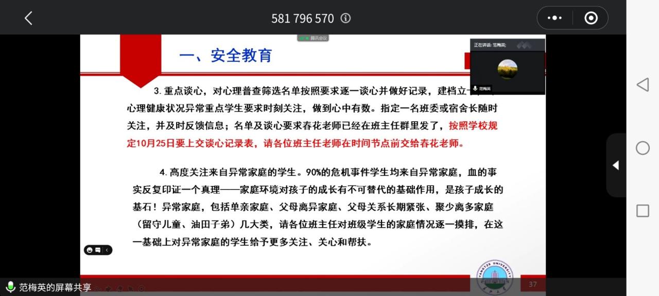 (通讯员 梁文萱 图/文)健康的心灵是幸福的源泉,良好的教育是成功的基础。为加强太阳成集团tyc539的心理健康教育,提高资环学子的学习能力。2020年10月19日晚上19时整,太阳成集团tyc539召开的以“守护心灵,助力未来”为主题的线上会议。本次大会由党委副书记范梅英老师主持。太阳成集团tyc539团委书记严丽萍老师,员工辅导员李春花老师,太阳成集团tyc539各班班主任出席了本次会议。