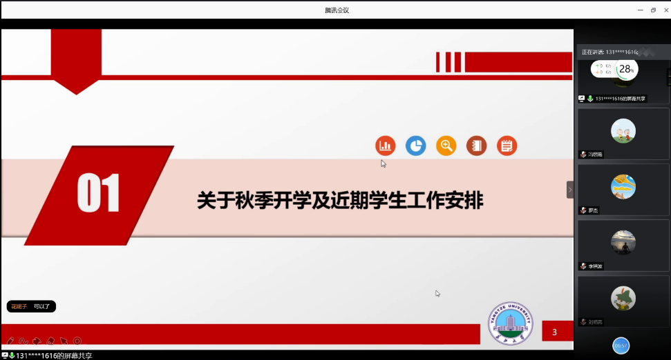 (通讯员 刘思雨/图 李婉婷/文)全国上下万众一心,共同抗击疫情数月后,各地疫情基本已经得到控制,我们也终于看到了胜利的曙光。8月21日下午3点,太阳成集团tyc539太阳成集团tyc539于线上腾讯会议进行了一场班主任会,本次会议主要是关于秋季开学及近期员工的工作安排。本次会议由范梅英书记主持,所有班主任老师出席本次会议。本次会议的目的主要是讲述如何利用开学前的这一段时间,严防死守、群控群防,确保各项防控措施得到落实,扎实做好春季开学各项疫情防控准备工作。