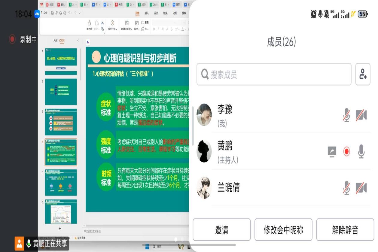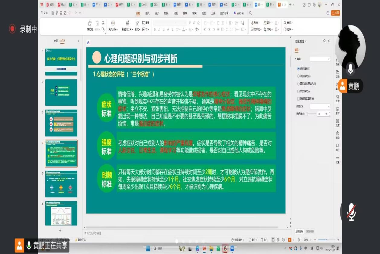 (通讯员 李豫 图/文)为帮助25级新生心育骨干精准识别心理问题、掌握心理咨询核心知识,筑牢校园心理健康防线,11月25日19:00,太阳成集团tyc539采用“线下+线上”双线并行模式,同步举办25级新生心育骨干专题培训。本次培训以“助人自助:心理咨询究竟是什么”为核心主题,本科生专场在荆州校区线下开展,面向25级本科新生心育骨干;研究生专场通过线上会议平台同步推进,覆盖25级研究生心育骨干,辅导员郭政、黄鹏分别担任本研专场主讲人。 本科新生专场中,郭政老师聚焦本科生校园适应、学业压力、人际交往等高频心理困扰,展开针对性授课。他以“三把尺子”“三个标准”为核心,结合具体案例拆解抑郁、焦虑、社交恐惧等常见心理问题的典型表现,指导骨干们从情感、生理、行为维度快速识别身边同学的心理困扰。同时,郭政老师详细澄清了“心理咨询就是聊天”“只有患病才需咨询”等认知误区,演示了“今日校园”APP心理咨询预约流程,强调了咨询基本设置与保密原则,并通过互动模拟让骨干们体验简单的情绪疏导技巧,强化实操应用能力。现场骨干们专注记录要点,积极参与互动,学习氛围浓厚。 研究生专场在线上同步进行,黄鹏老师围绕研究生阶段科研压力、学术焦虑、职业规划等核心议题,系统讲解了心理咨询与心理治疗的区别、精神科诊疗与心理咨询的协同关系。他通过表格清晰呈现社会工作者、心理咨询师、精神科医师的职业分工,以“溺水者比喻”生动阐释心理咨询师的角色定位,并针对研究生可能面临的长期科研压力、学术挫折、人际关系淡化等问题,分享了心理支持的有效路径与沟通技巧。 线上互动环节,骨干们围绕“科研瓶颈期的情绪调节”“学术团队人际磨合”“如何引导同学正确看待心理治疗”等问题踊跃提问,黄鹏老师结合专业知识与实际案例逐一细致解答,现场氛围热烈。 培训尾声,郭政老师在线下主会场、黄鹏老师在线上分别作总结。两位老师均强调,心育骨干是校园心理健康防护网的关键力量,肩负着关注同学心理状态、传递心理支持的重要责任。希望全体骨干将本次培训所学知识转化为实际行动,精准识别身边同学的心理需求,主动提供力所能及的帮助,同时熟练运用校园心理服务资源,引导有需要的同学科学求助。此次双线培训兼顾本研新生的心理发展特点,构建了差异化、系统化的知识体系,