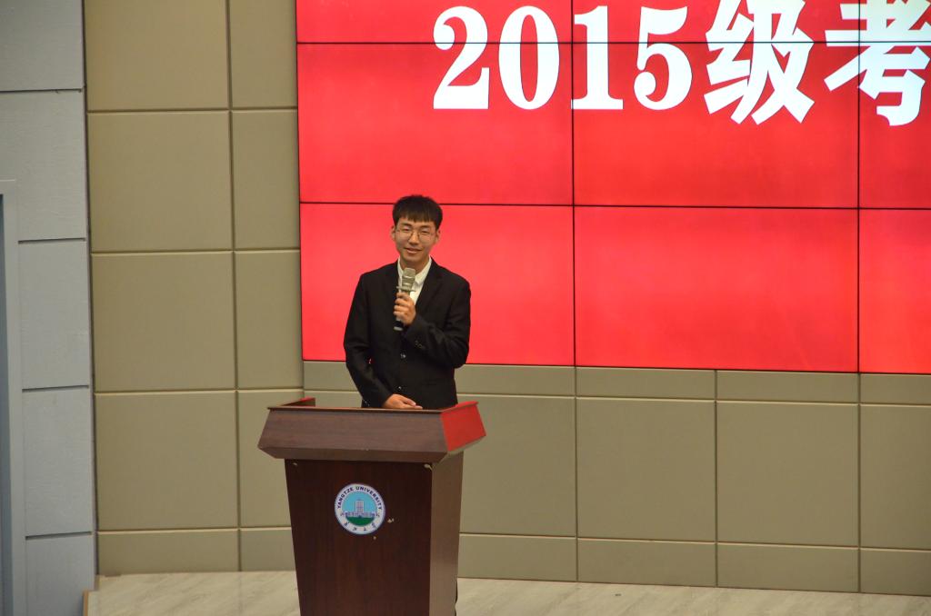 表彰完毕,考研优秀个人代表致辞。15级代表李彰鹏坚决反对没有明确目标的同学考研。随波逐流、漫无目的地考研只是浪费精力,而找准目标、为之奋斗,便能在考研路上披荆斩棘。