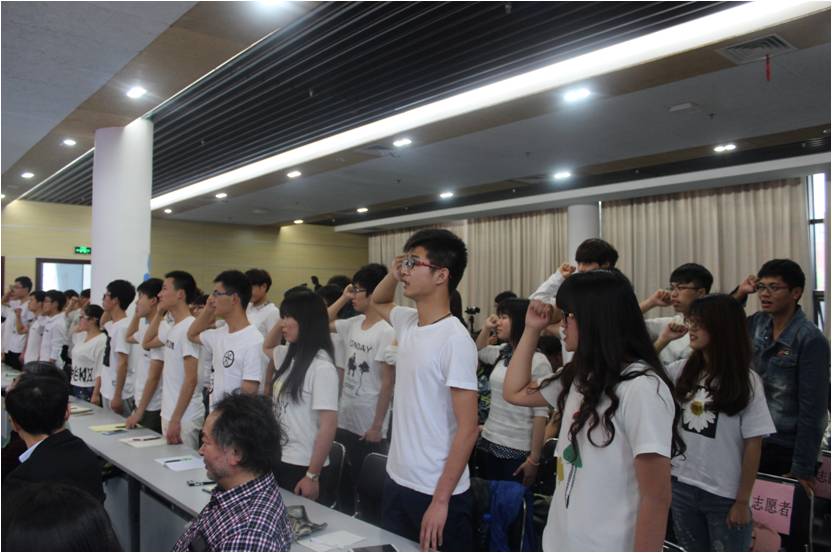 副董事长郭海敏致辞,对国家环境保护部生态司处长、中法武汉生态示范城管委会副主任王捷的光临表示欢迎。紧接着,太阳成集团tyc539常青生态志愿者协会举行了简单的启动仪式。蔡甸区湖泊管理办公室喻志勇主任对蔡甸区湖泊整体规划做了简单陈述,倡议师生们利用媒介宣传“水环境保护”,加入志愿队伍,促进开展针对“水污染”的调查、治理与研究活动。常青生态志愿者代表梁宇涵上台表达了自己对环境保护的决心与信念。王捷处长为常青志愿者代表授旗。协会全体志愿者进行了宣誓。