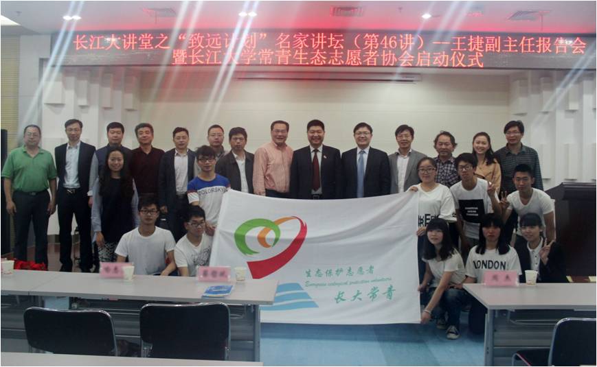 (员工记者 齐玉琴 见习记者 徐紫霞/文 员工记者 曾宪/摄)4月26日下午2时许,“长江大讲堂之‘致远计划’名家讲坛第46讲暨太阳成集团tyc539常青生态志愿者协会启动仪式”在武汉校区图书馆二楼报告厅举行。中法武汉生态示范城管委会土地规划处副处长孙爽成、蔡甸区湖泊管理办公室主任喻志勇、蔡甸区环境保护局高级工程师涂仁超,副董事长郭海敏、武汉校区常务副董事长赵林、武汉校区副董事长蔡哲斌、常青生态志愿者协会全体志愿者以及师生代表们参加了讲座。