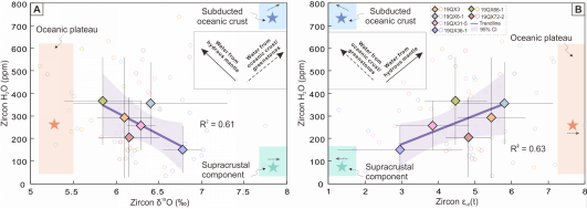 针对这个问题,该研究团队开发了大型二次离子质谱锆石水含量和氧同位素同时测定方法并应用于早期TTG岩石,综合锆石的水含量、氧同位素、微量元素和U-Pb-Hf同位素,以及全岩主微量元素数据,首次揭示了华北克拉通东部陆块约25亿年前TTG岩石具有“低水含量”和“高氧同位素δ18O”的特征(图1、图2)。尽管俯冲洋壳或表壳岩的加入都可以形成TTG的高δ18O特征,但通过与华北克拉通中部造山带俯冲相关的同时代TTG对比,以及用相图模拟不同端元对源区的水含量贡献,源区中的少量壳源物质被限定为凹沉作用带入的而非俯冲作用带入的表壳岩。研究还发现TTG的锆石水含量与O同位素呈现负相关性,与Hf同位素成正相关(图2),进一步证明TTG的水来源于幔源洋底高原而非传统认为的壳源物质。研究结果表明该TTG的基性源区为洋底高原玄武质岩石与少量表壳岩混合形成。