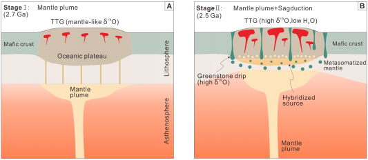 因此,研究的TTG岩石形成于地幔柱构造环境,而不是俯冲成因。根据U-Pb-Hf同位素数据,该TTG的二阶段模式年龄为27亿年前。在此基础上,研究团队提出了“两阶段地幔柱—凹沉模型”(图3):在第一阶段(约27亿年前),地幔柱上涌形成洋底高原,其部分熔融可形成少量TTG岩石(低水含量,幔源δ18O),洋底高原上部的表壳岩与海水相互作用;在第二阶段(约25亿年前),新的地幔柱上涌,表壳岩发生重力沉降进入先前形成的洋底高原底部,与幔源的洋底高原玄武质岩石混合。地幔柱的热量促使混合的铁镁质源区熔融,并生成大量TTG岩石(低水含量,高δ18O)。