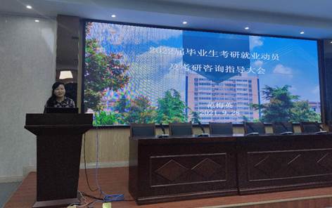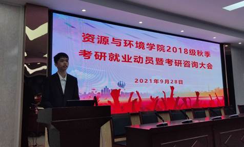 会议伊始,由研究生代表刘于民同学进行发言。他结合自己的实际,向同学们分享了如何兼顾就业和考研复习,不管是考研还是就业,都要充分评估自己,准确定位,并充满信心,在考研和就业的双向选择上更好地把握机会。