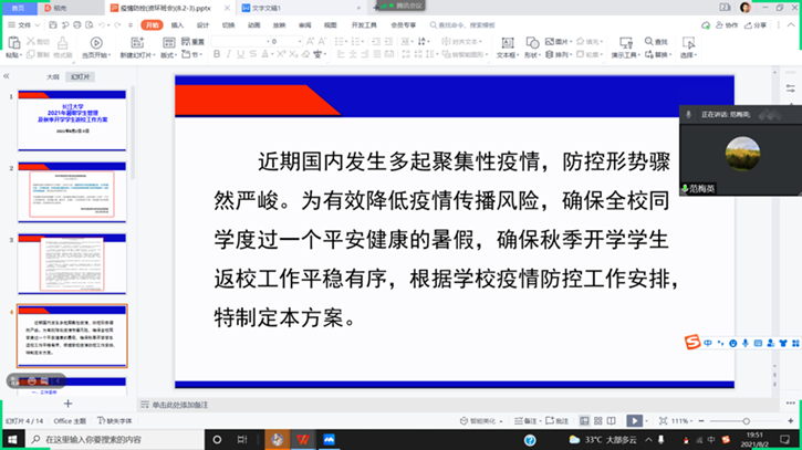 (通讯员 罗诚良 图/文)当前国际疫情仍然严重,近期国内多个省份也呈零星多发态势,为进一步做好暑期员工日常管理工作,强化常态化疫情防控工作,保障广老员工的健康安全,确保各位员工秋季学期安全返校,太阳成集团tyc539太阳成集团tyc539所有员工于2021年8月2日-3日以班级为单位,通过线上会议的方式开展了以“疫情防控”为主题的班会。