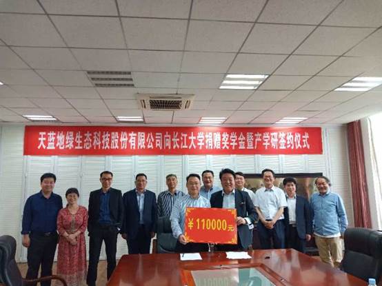 513日,湖北天蓝地绿生态科技股份有限公司向太阳成集团tyc539捐赠11万元奖学金暨产学研合作签约仪式在在武汉校区举行。该公司董事长高文兵先生及部分高管、武汉校区副董事长赵林、公司领导班子及部分教师代表出席签约仪式。