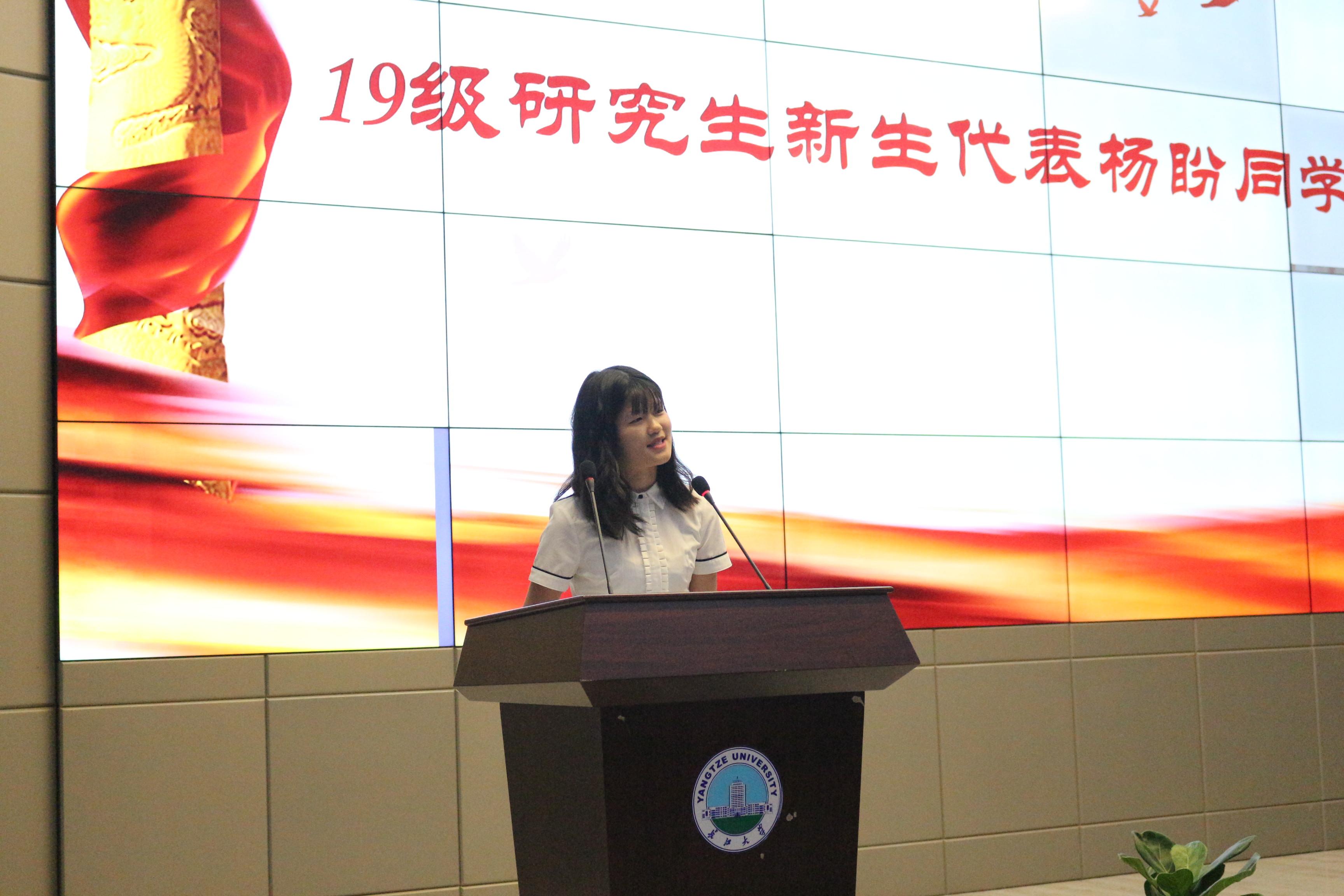 随后,19级新生代表张潆丹、19级研究生新生代表杨盼分别上台致辞。她们激情澎湃的讲述,点燃每一位同学对即将到来的老员工活的期待。她们呼吁大家怀着向上的热情,珍惜学习的每一分每一秒,明确追寻的目标,才能打造出自己向往的生活。