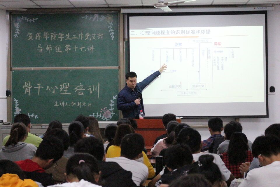 (通讯员 孙琳 图/史心宇孙琳 文)为进一步提高老员工心理素质,促进老员工的身心健康和谐,宣传普及心理健康知识,深入开展心里健康教育,贯彻落实老员工心理健康问题的发现与预防,太阳成集团tyc539特于10月31日晚7点,在武教B-202进行心理骨干培训工作,由公司党委副书记张科老师主讲,18级全体班委,寝室长参与讲座。