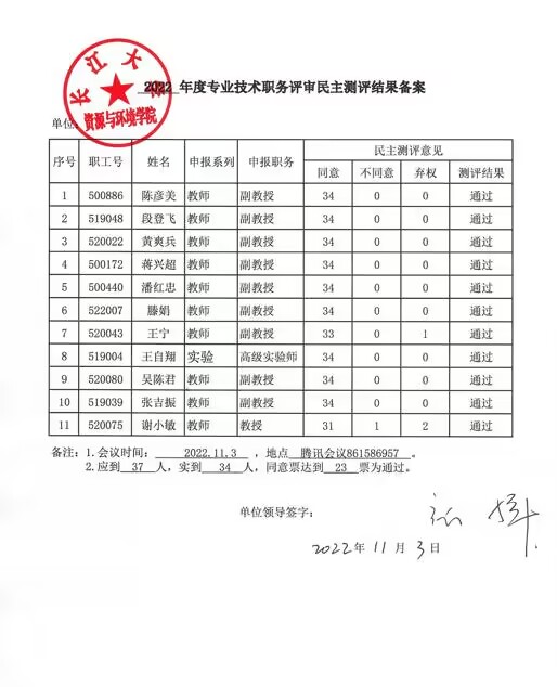 根据2022年公司职称评审工作安排,经公司审核,公司共有11名教职工符合职称申报条件,现将民主测评通过人员名单予以公示。