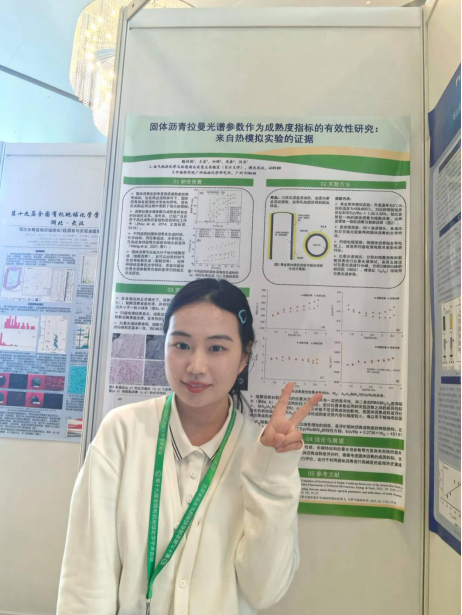魏诗韵同学的展板成果《固体沥青拉曼光谱参数作为成熟度指标的有效性研究:来自热模拟实验的证据》,针对固体沥青光学各向异性导致的成熟度评价误差问题展开研究。在导师刘岩教授指导下,她通过黄金管热模拟实验,将固体沥青细分为“缩聚沥青”与“裂解沥青”两类,并系统分析8种常用拉曼光谱参数的有效性。